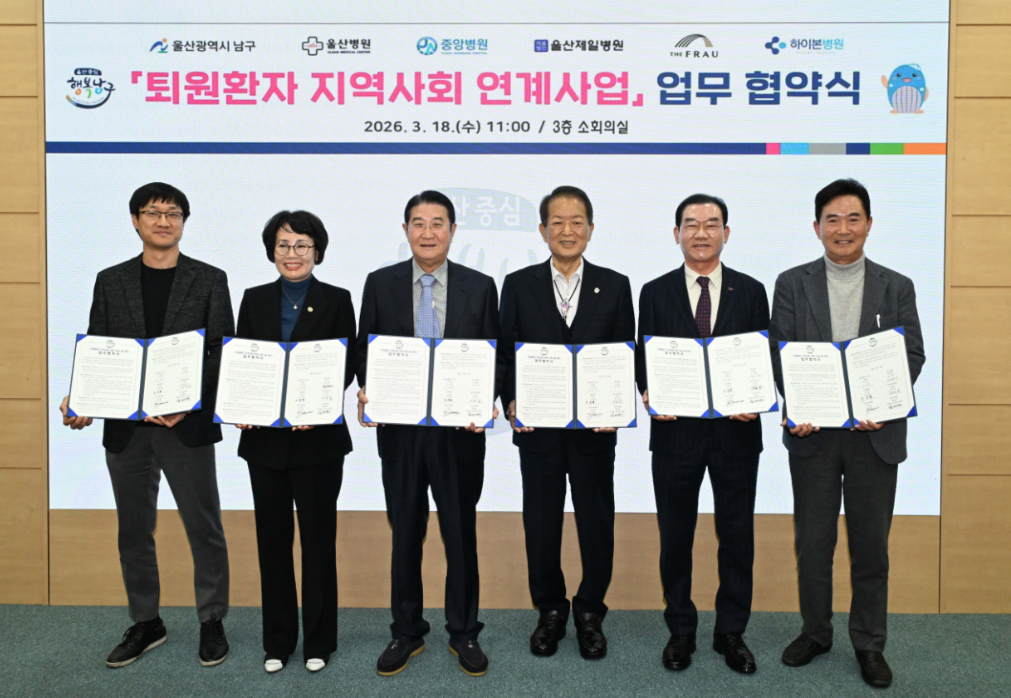 [울산=뉴시스] 안정섭 기자 = 울산시 남구는 18일 퇴원 환자의 지역사회 복귀와 안정적인 일상 회복을 지원하기 위해 관내 의료기관 5개소와 업무협약을 체결했다고 밝혔다.